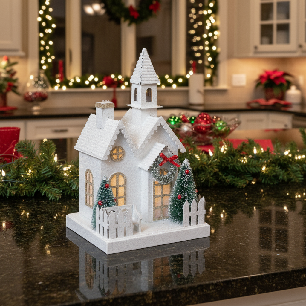 Transform your holiday decor with this enchanting lighted village meeting house church decoration. Standing 10 inches tall, 5.75 inches wide, and 5 inches deep, this charming piece features intricate glittered white details with elegant gold accents. The paper construction showcases ornate windows and decorative trim, creating a magical Christmas display. A metal bell adorns the steeple, while miniature sisal Christmas trees and a festive wreath add natural charm. The interior illumination creates a warm, welcoming glow, perfect for creating a cozy holiday atmosphere. The convenient battery-operated timer function runs for 6 hours on and 18 hours off, automatically relighting at the same time each day. Requiring 2 AAA batteries (not included), this delightful decoration brings the spirit of a winter village to your home. The glittered finish adds a spectacular sparkle to your seasonal display, making it an eye-catching centerpiece for any tabletop, mantel, or holiday vignette.
