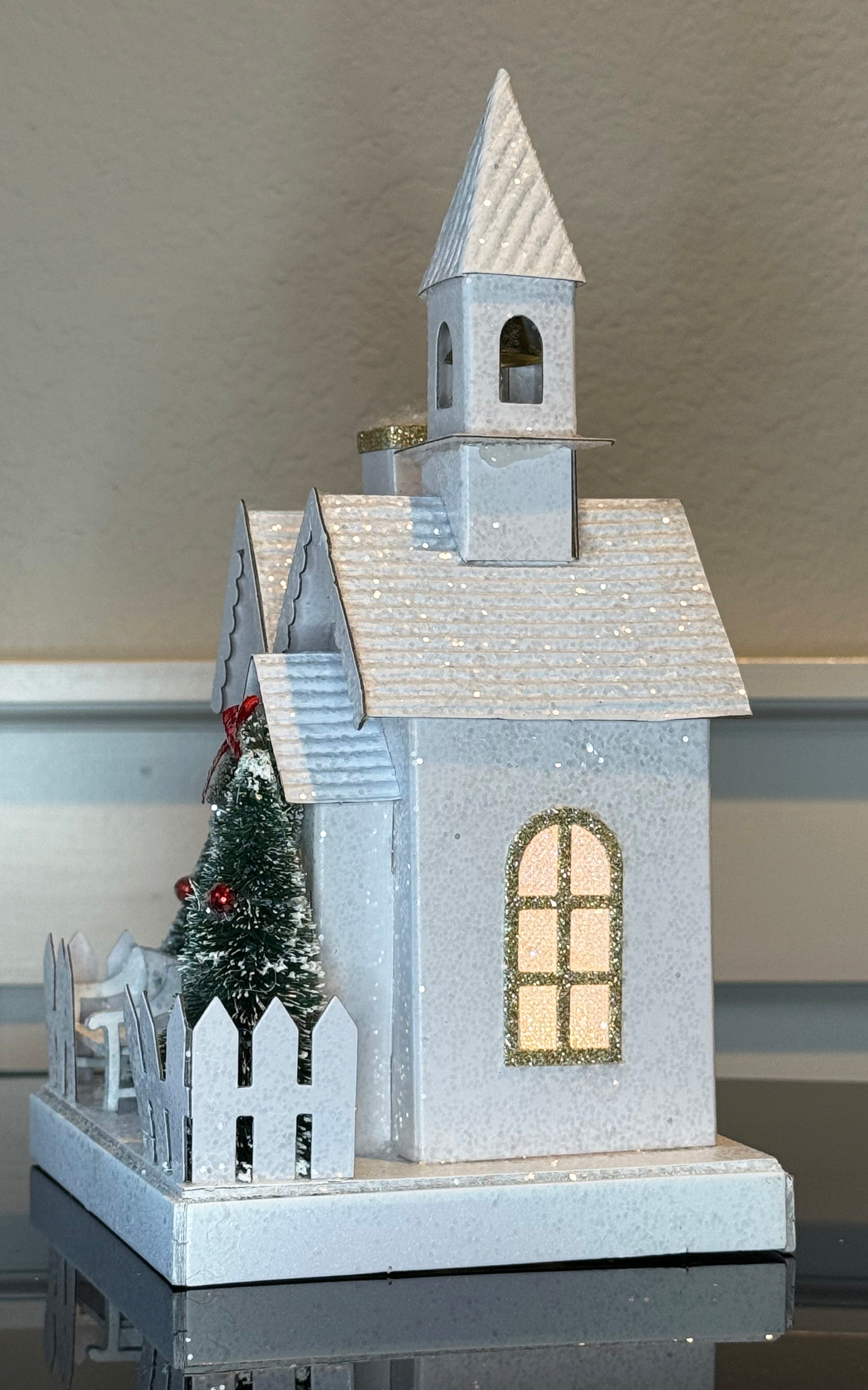 DISPLAY APPEAL: Charming church-style meeting house design creates a magical illuminated village scene for holiday decorating