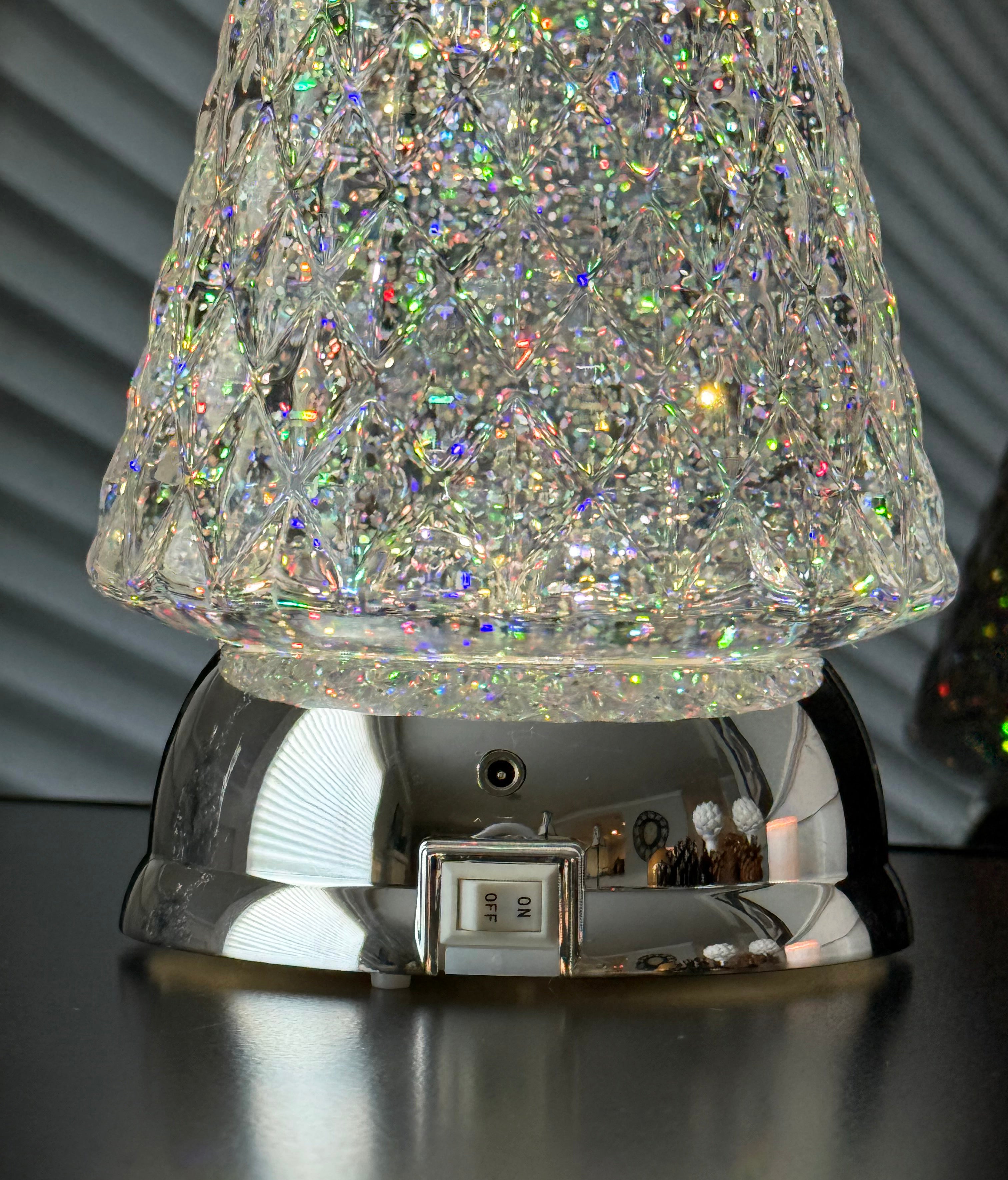 Transform your holiday decor with this enchanting 12-inch LED Christmas tree water globe lantern. The clear acrylic tree features an intricate crystalline diamond shaped texture that creates a magical display when illuminated, topped with a striking star. Mesmerizing glittered particles swirl inside, creating a captivating snow globe effect that brings the wonder of winter indoors. The contemporary design sits atop a sleek silver-finished base measuring 4.5 inches wide, while the tree itself spans 5 inches in diameter. This versatile piece offers dual power options - run it via the included USB cord or use batteries for cordless operation(requires 3 AA batteries, not included). The combination of modern LED technology and traditional snow globe charm makes this piece perfect for mantels, tabletops, or as a centerpiece. The durable acrylic construction ensures this decorative piece can be enjoyed season after season, while the polished silver base adds a touch of sophistication to any holiday display. Whether illuminated or not, this water globe lantern serves as an elegant addition to your Christmas decorations.