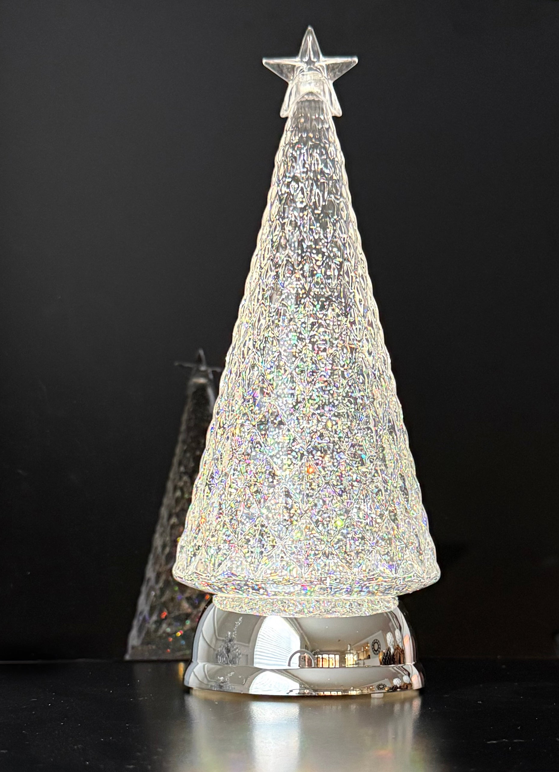 LED Christmas Tree Water Lantern, 12 inch Height, Clear Acrylic with Silver Base, USB or Battery Operated, Christmas Snow Globe