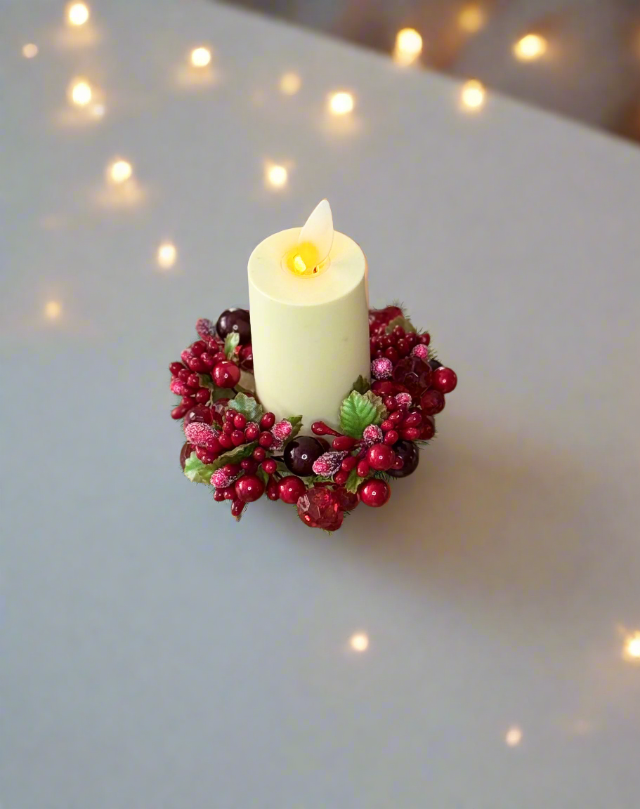 Add an elegant touch to your holiday decor or special occasions with this exquisite 4-inch candle ring. Featuring a stunning combination of faceted crystals and pearlized berries in red and burgundy tones, this versatile piece creates a sophisticated accent for your table settings. The carefully crafted ring accommodates taper candles up to 1-3/4 inches in diameter or similarly sized votives (candle not included). Standing 1.5 inches high, the arrangement showcases glass-coated artificial berries and sparkling crystal elements that catch and reflect light beautifully. The wired stems allow for easy arranging and adjusting to achieve your desired look. Perfect for Christmas celebrations, wedding centerpieces, or spring gatherings, this timeless candle ring brings a touch of sparkle and refinement to any setting. The green-wrapped base provides a secure foundation while remaining discreet. Transform your candlesticks or votive holders into stunning focal points with this versatile decorative accent.