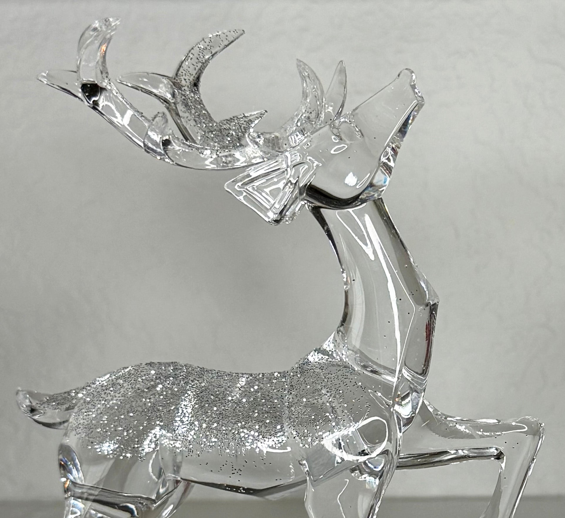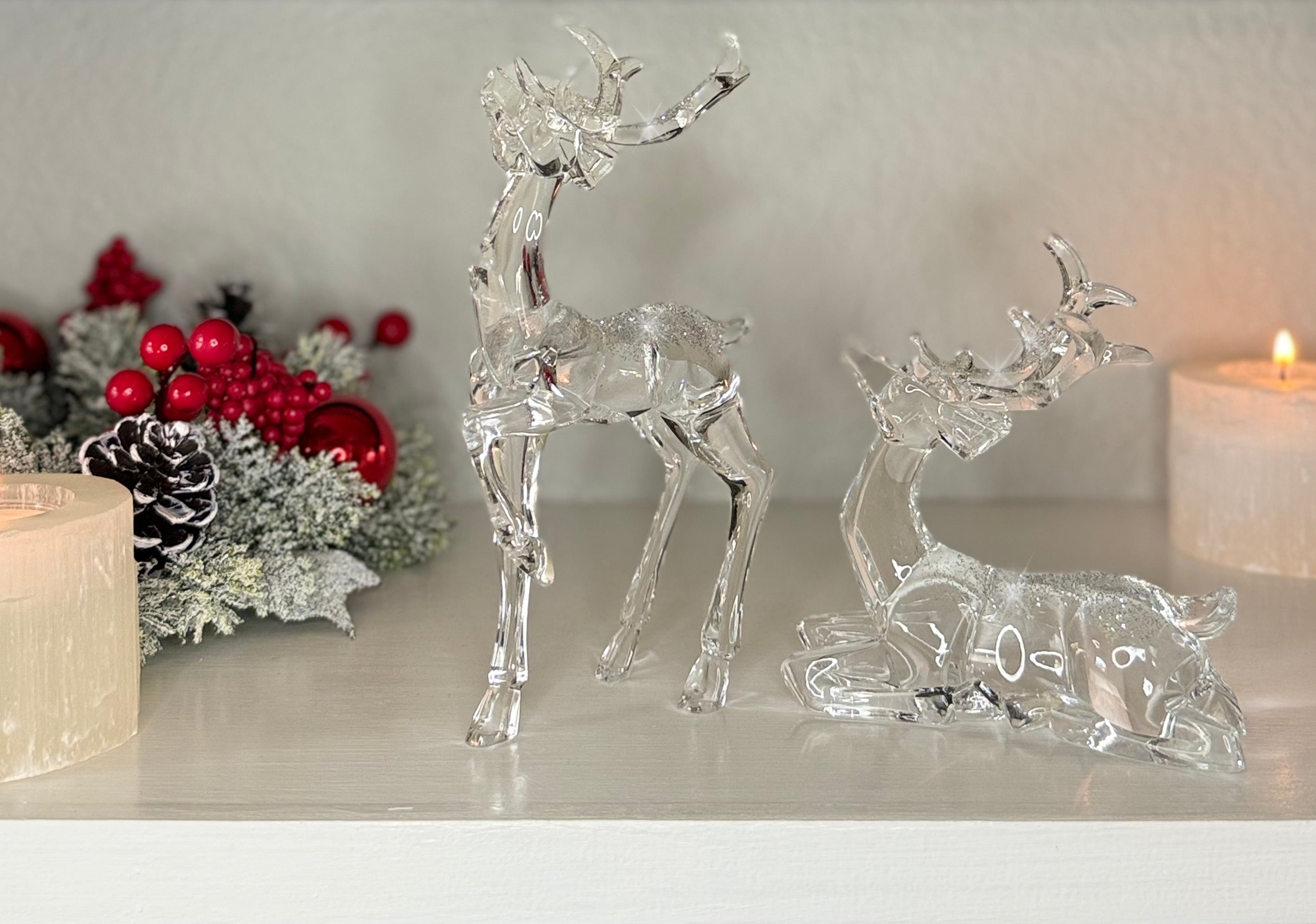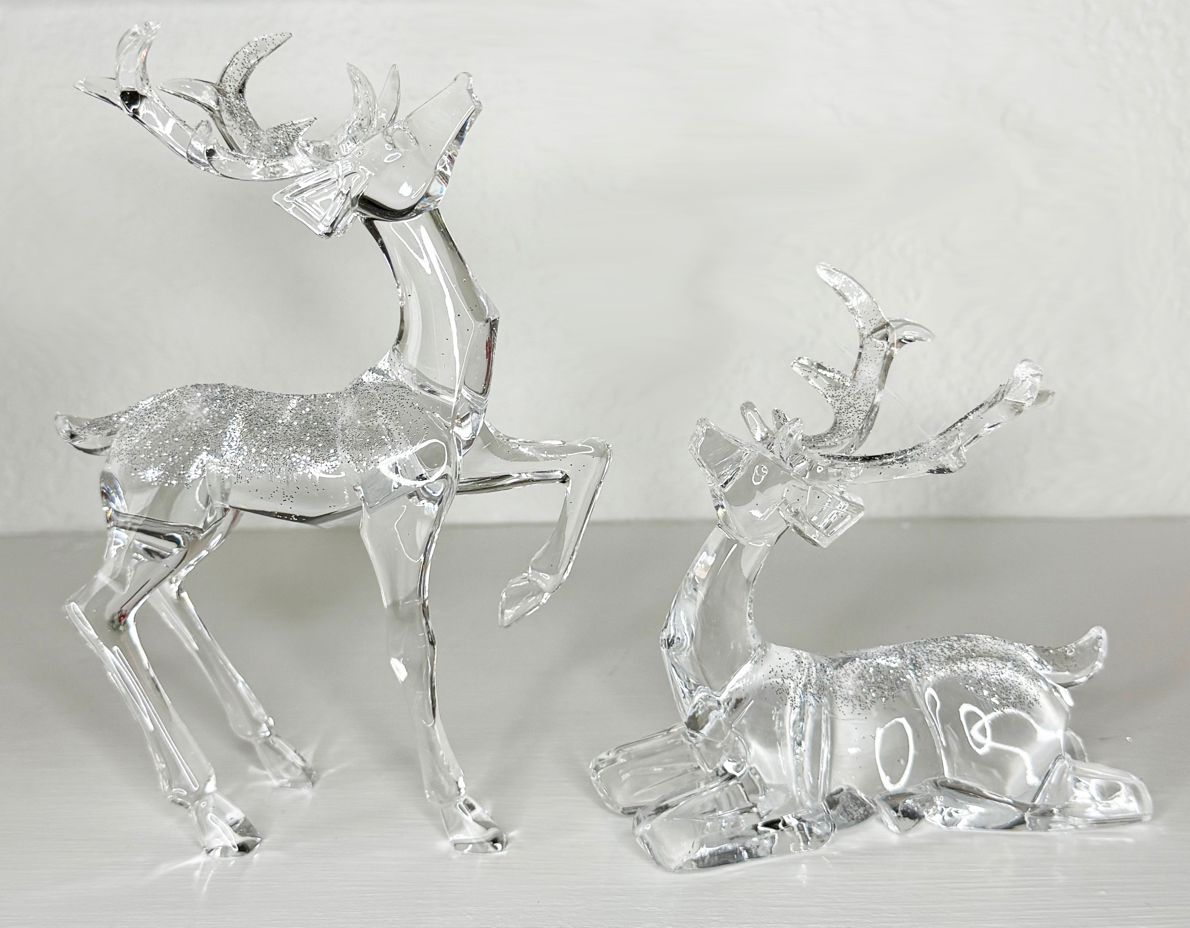 ELEGANT DESIGN: Set of 2 crystal-look acrylic reindeer sculptures featuring sparkling glitter accents on antlers and backs for enchanting holiday displays