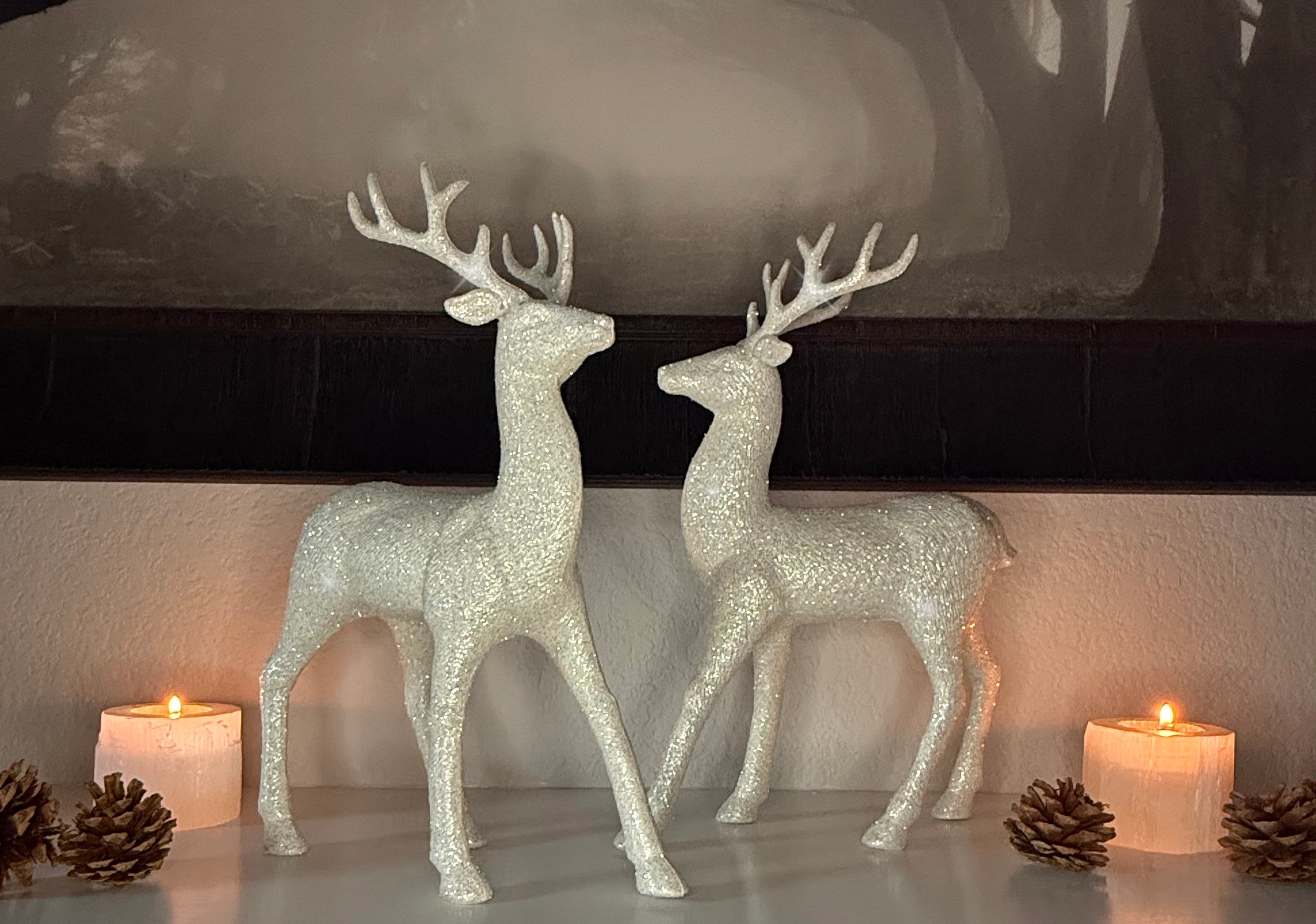 Elegant, classy small reindeer are perfect for use on a mantel, shelf or tabletop in the dining room, living room, etc. Looks gorgeous in a winter scene with greenery & lights.
