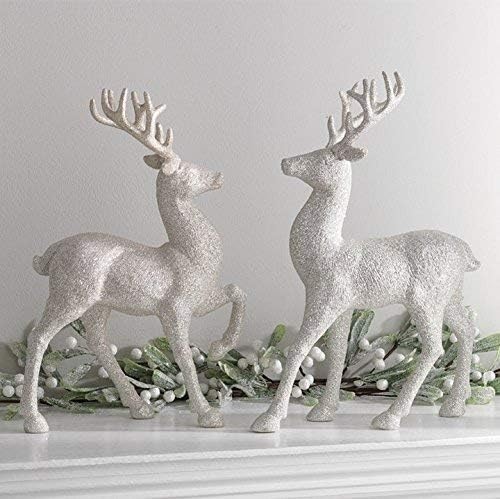 Create a sophisticated winter woodland look this holiday season or throughout the year. RAZ Imports silver glitter reindeer figurines add an elegant touch to mantels, table scapes, centerpieces, etc. Includes two silver-toned. Standing reindeer figurines measure 12.5" X 8.5". High quality reindeer decor made of sturdy plastic with a light silver glitter finish. For indoor use only. Elegant, classy small reindeer are perfect for use on a mantel, shelf or tabletop in the dining room, living room, etc. Looks gorgeous in a winter scene with greenery & lights. Deer statues can be used as a decoration inside your home year round, not just at the holidays.