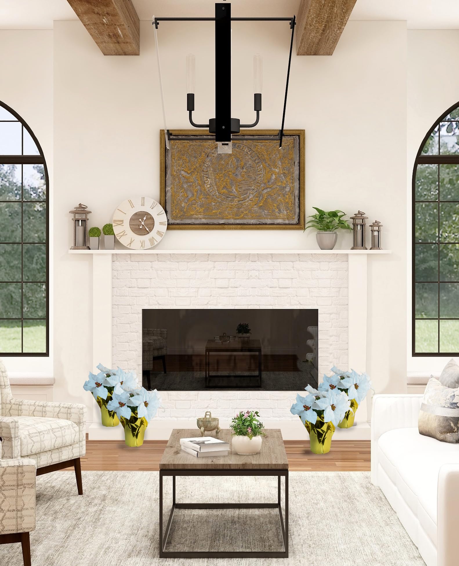 Transform your holiday decor with this stunning artificial white poinsettia plant arrangement. Standing 15 inches tall, this elegant piece features 5 luxurious white poinsettia blooms with realistic detailing, each carefully positioned on adjustable wired stems that allow you to create your perfect display. The arrangement can spread up to 12 inches wide, making a striking statement in any space. The plant comes beautifully presented in a sophisticated gold foil-wrapped base, adding a touch of glamour to your festive decorations. The sturdy base measures 4 inches in diameter at the bottom, expanding to 5 inches at the top, and features a realistic faux loam topsoil finish. Perfect for creating dramatic holiday displays, these artificial poinsettias can be grouped together on stairs, placed in entryways, or used as elegant centerpieces. The maintenance-free design ensures lasting beauty throughout the season, while the classic white blooms coordinate seamlessly with any holiday color scheme. Create stunning seasonal displays by combining multiple plants for maximum impact in your holiday decorating.