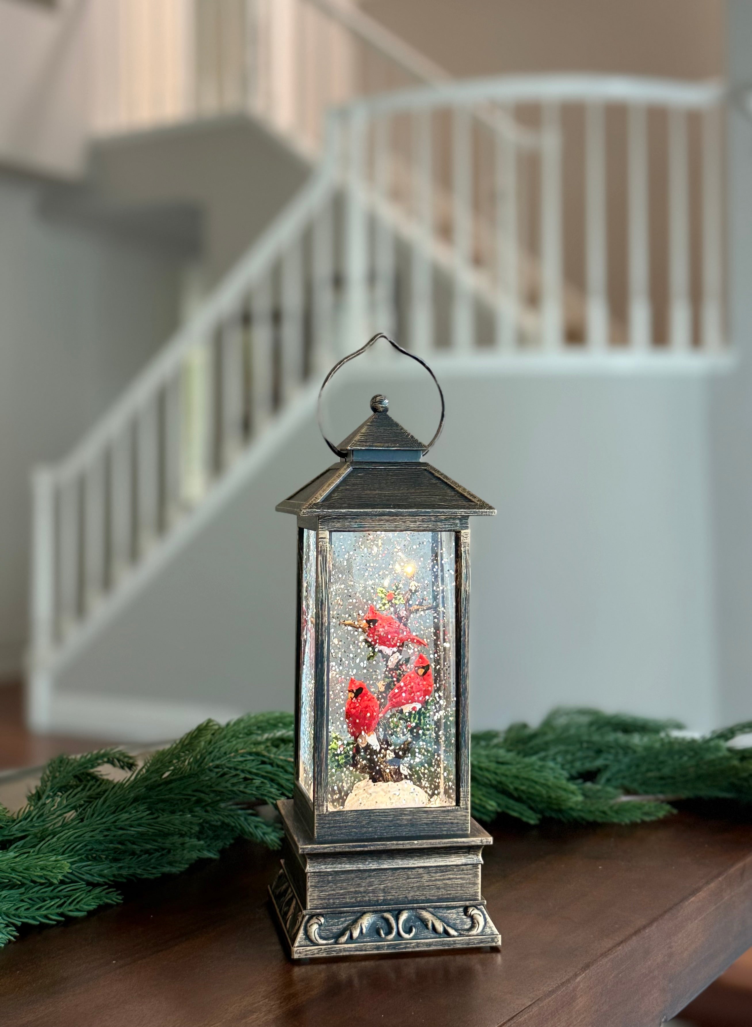 Transform your holiday decor with this enchanting 11-inch Cardinal Snow Globe Lantern, featuring a stunning scene of vibrant red cardinals perched on a delicate branch. This elegant water lantern combines classic design with modern convenience, showcasing a mesmerizing swirling glitter snow effect that creates a magical winter atmosphere. The bronze-finished lantern, crafted from durable acrylic and plastic materials, offers the classic look of glass without the fragility. Illuminated by built-in LED lights, it casts a warm, inviting glow that brings the cardinal scene to life. Standing 11 inches tall, with an additional hanging hook, and 4.25 inches wide This versatile decoration can be powered either by 3 AA batteries (not included) or the included USB cord. The convenient timer function operates for 6 hours on and 18 hours off, automatically activating at the same time each day. Perfect as a centerpiece or hanging decoration, this snow globe lantern combines traditional holiday charm with contemporary functionality, making it an ideal addition to your seasonal display or a thoughtful gift for cardinal enthusiasts.