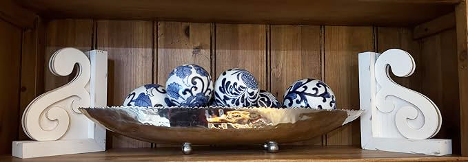 Transform your shelves with these elegantly designed corbel-style bookends that blend form and function beautifully. Each bookend in this set of two measures 7-7/8 inches high, 5-7/8 inches wide, and 2 inches deep, providing sturdy support for your book collection while adding architectural interest to your space. The white-washed finish gives these wooden bookends a versatile, timeless appeal that complements various decor styles from classic to contemporary. The intricate carved scroll design showcases sophisticated craftsmanship, creating a stylized corbel effect that adds visual interest whether used traditionally as bookends or as decorative accessories. Weighing 14.7 ounces each, these bookends are substantial enough to keep books upright while remaining easy to reposition. The classic design makes them suitable for living rooms, home offices, libraries, or anywhere you want to add both organization and visual appeal. Use them to dress up your bookshelf, frame your favorite novels, or create an eye-catching tabletop display.
