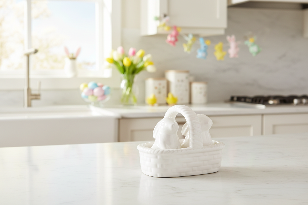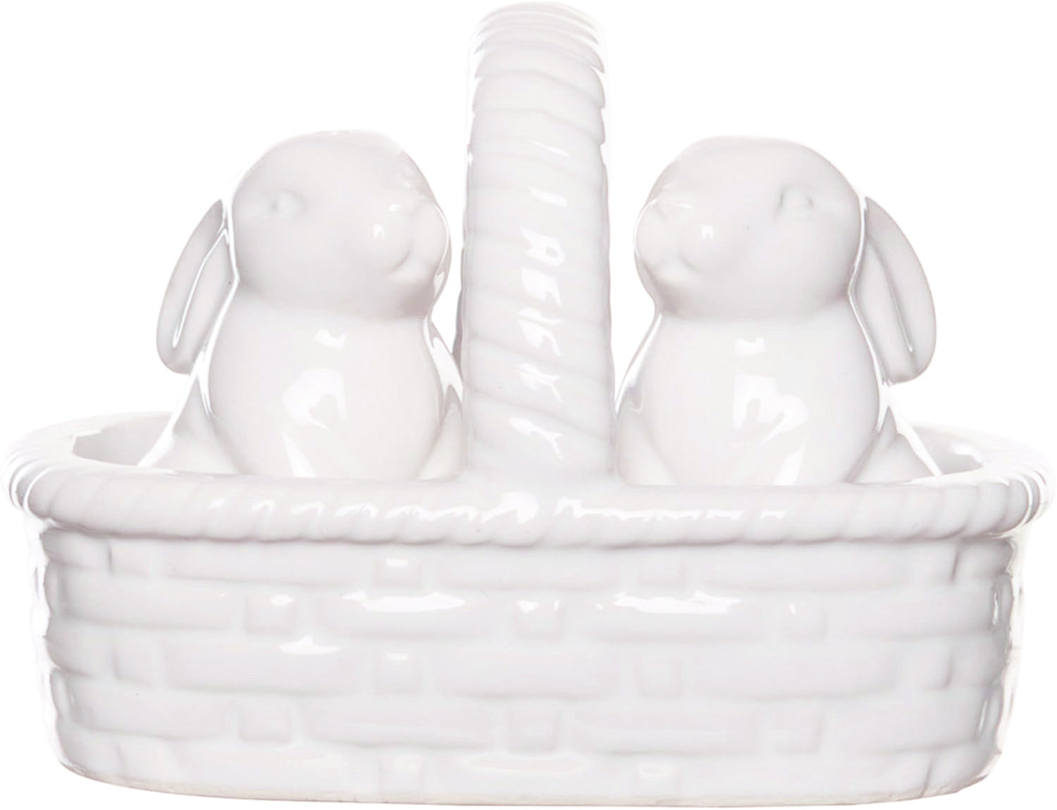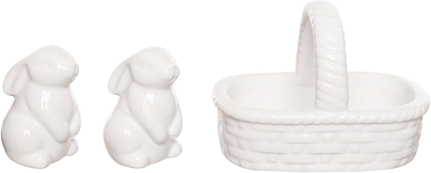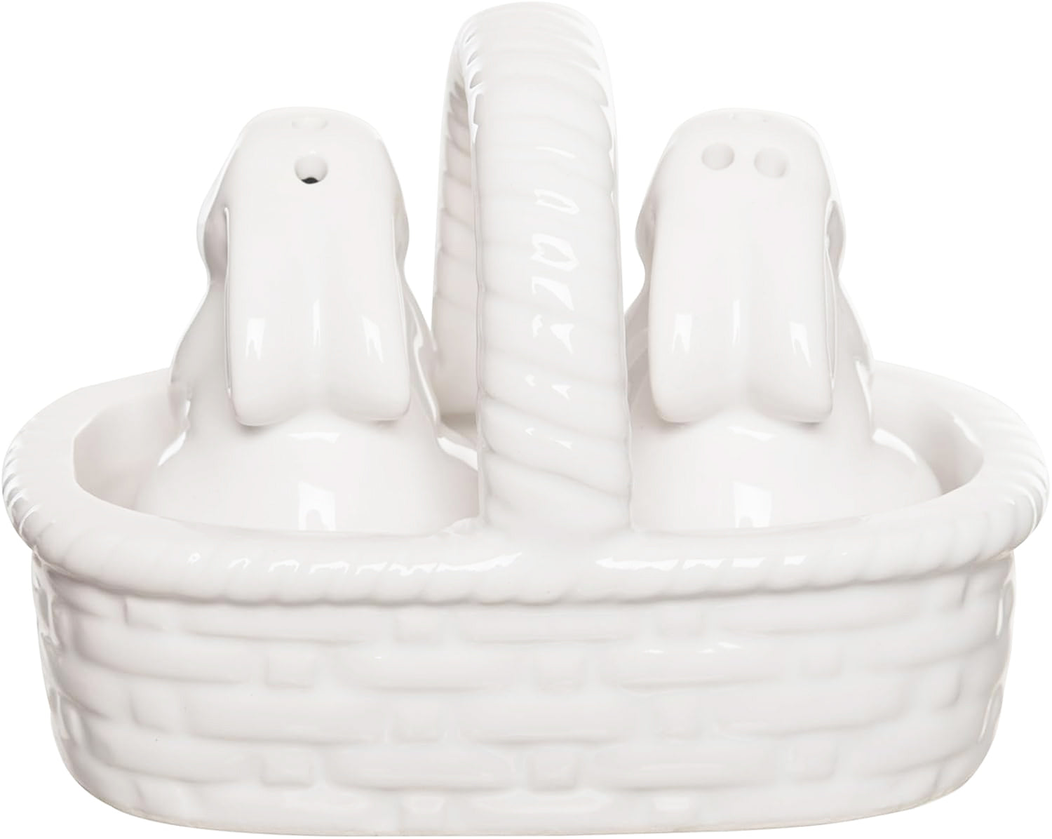 COMPLETE 3-PIECE SET: Includes two salt and pepper shakers shaped as bunnies plus a coordinating basket-style holder that keeps them together for convenient storage and display