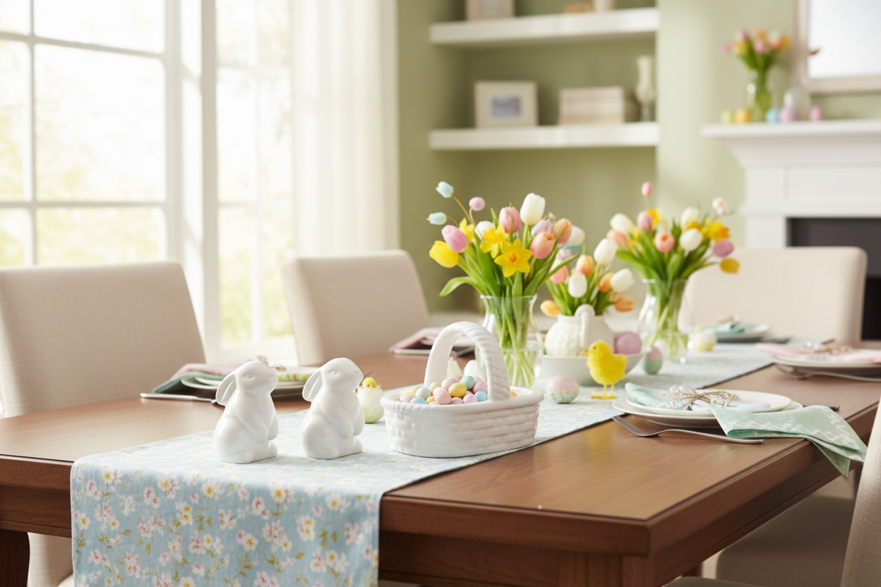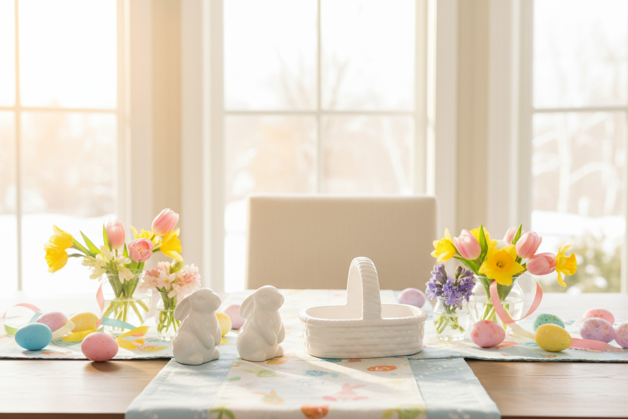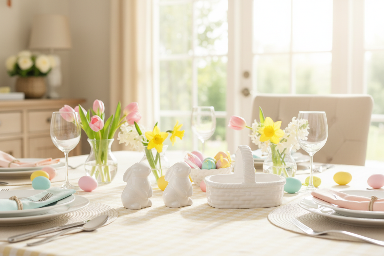 CHARMING DESIGN: Features two adorable ceramic bunny figurines nestled in a decorative basket weave base, creating a delightful Easter or springtime table centerpiece