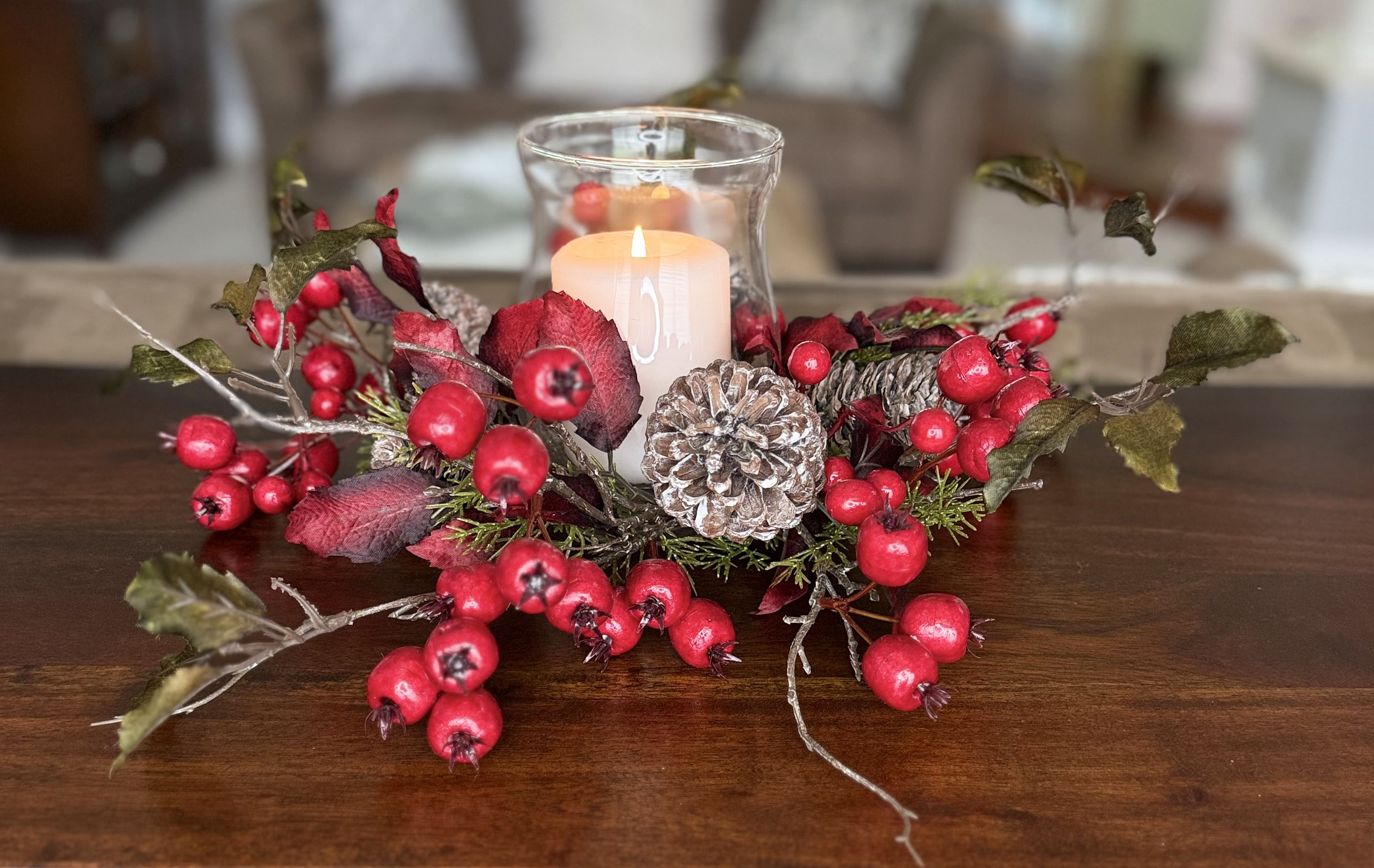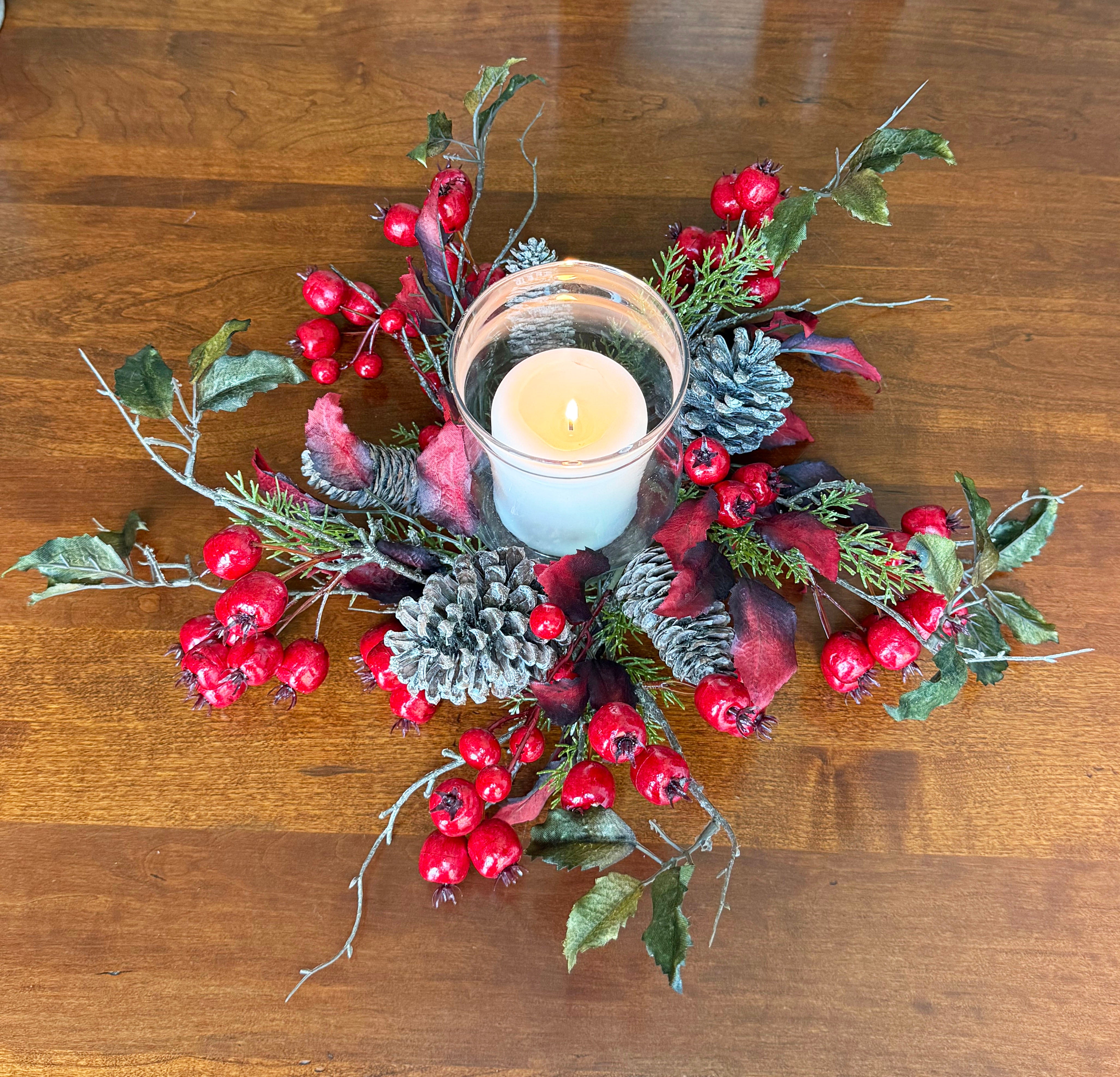 VERSATILE DESIGN: Elegant candle holder features realistic red berries, natural pinecones with white-washed finish, and decorative leaves on wired stems. Perfect accent for your decorating from Fall through to Christmas.