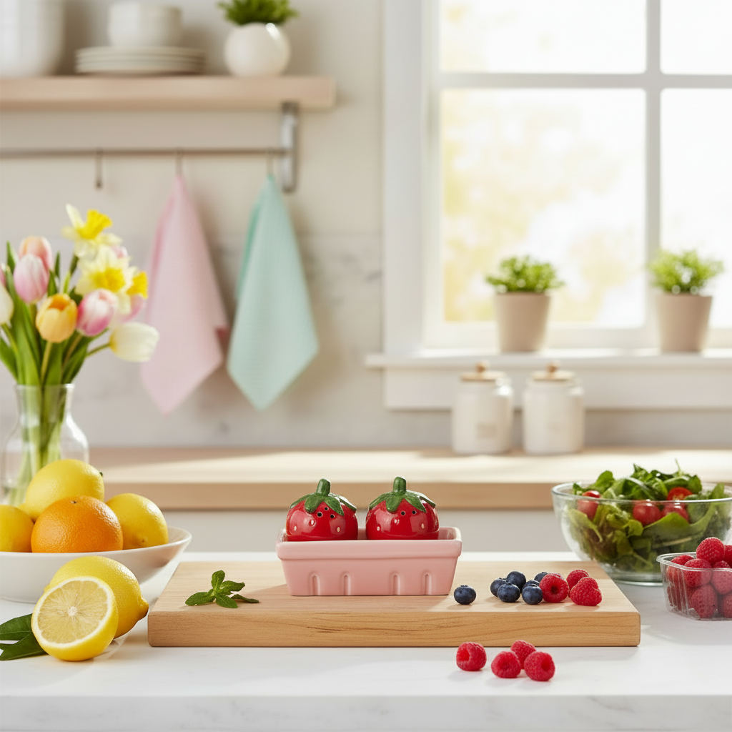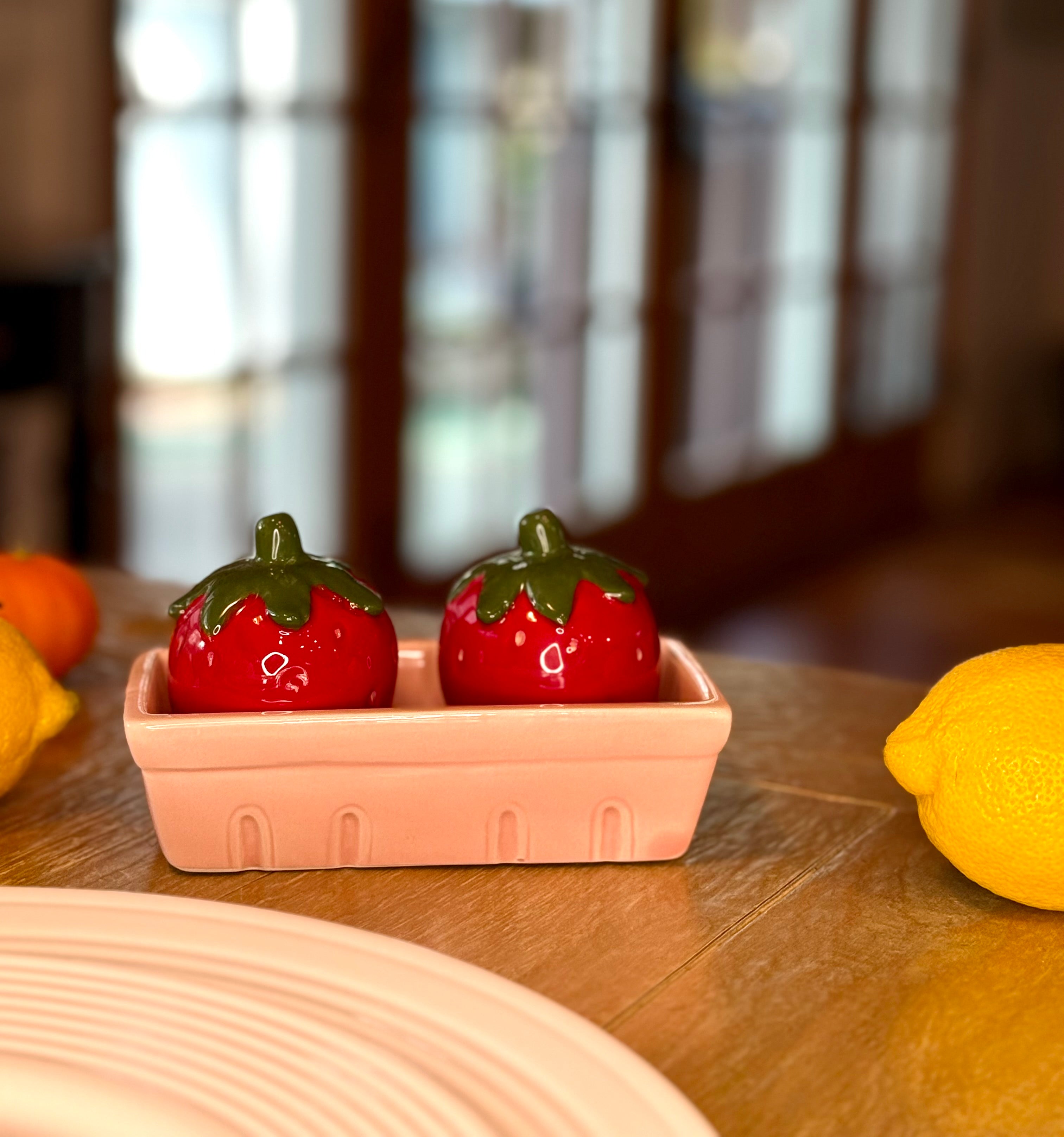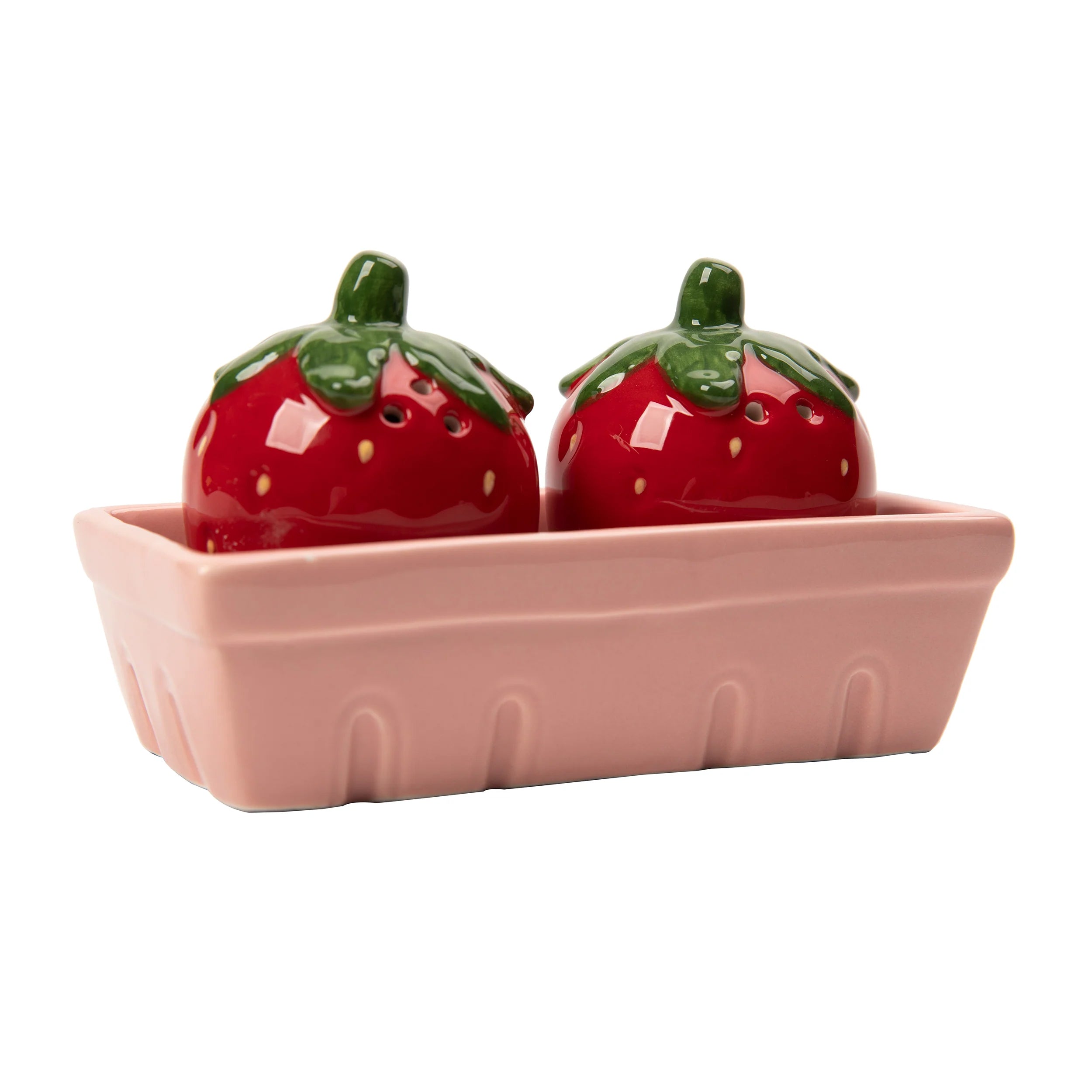 COMPLETE 3-PIECE SET: Includes 2 adorable strawberry-shaped salt and pepper shakers nestled in a charming pink berry basket tray for convenient storage and display. Shakers are medium size for convenient kitchen and dining use.